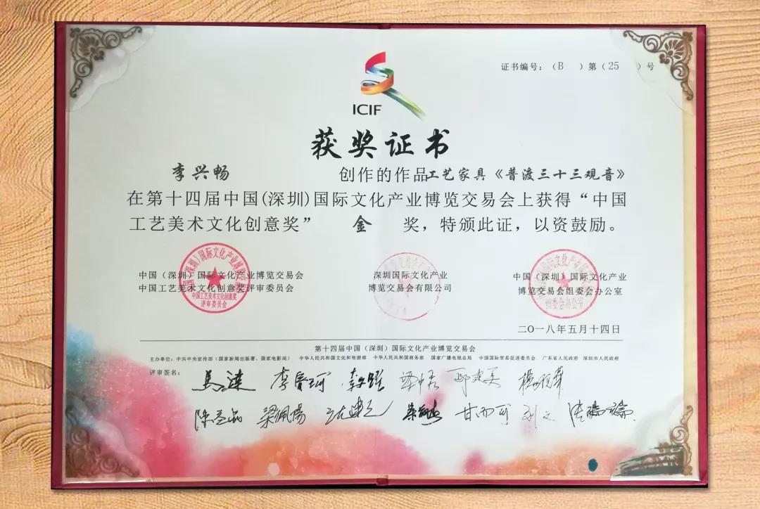 第十四届深圳文博会是一个推广中国传统文化和工艺美术的平台,这届深圳文博会共收集到了来自潮绣、金漆画、陶瓷、雕刻等多个传统工艺方面的作品,共计1826件,中山市太兴家具有限李兴畅董事长的雕刻作品《普渡三十三观音》参加了此次文博会的展览,并且可喜可贺的是这件作品获得了第十四届中国(深圳)国际文化产业博览交易会“中国工艺美术文化创意奖”金奖的荣誉。这是对中山市太兴家具在传承工匠精神、弘扬雕刻文化方面工作的肯定,鼓舞着太兴家具为弘扬中国传统文化的决心。第十四届深圳文博会是新时代下的扬帆再起航,对弘扬中华民族传统文化与传统工艺美术具有十分重要的意义,是对“工匠精神”的一次致敬。