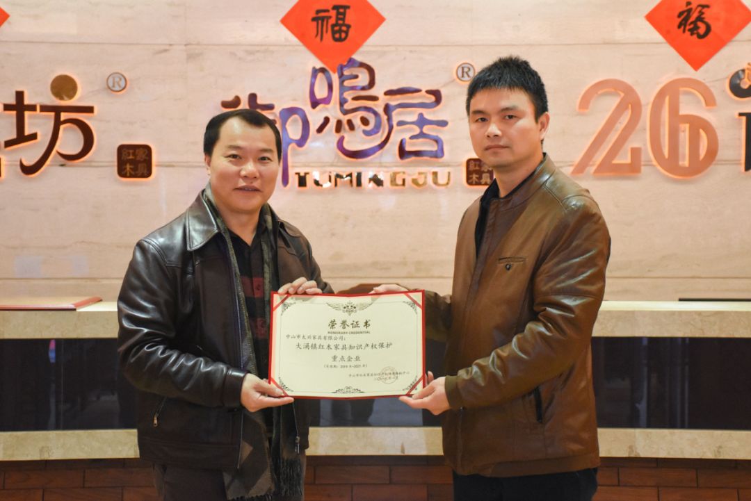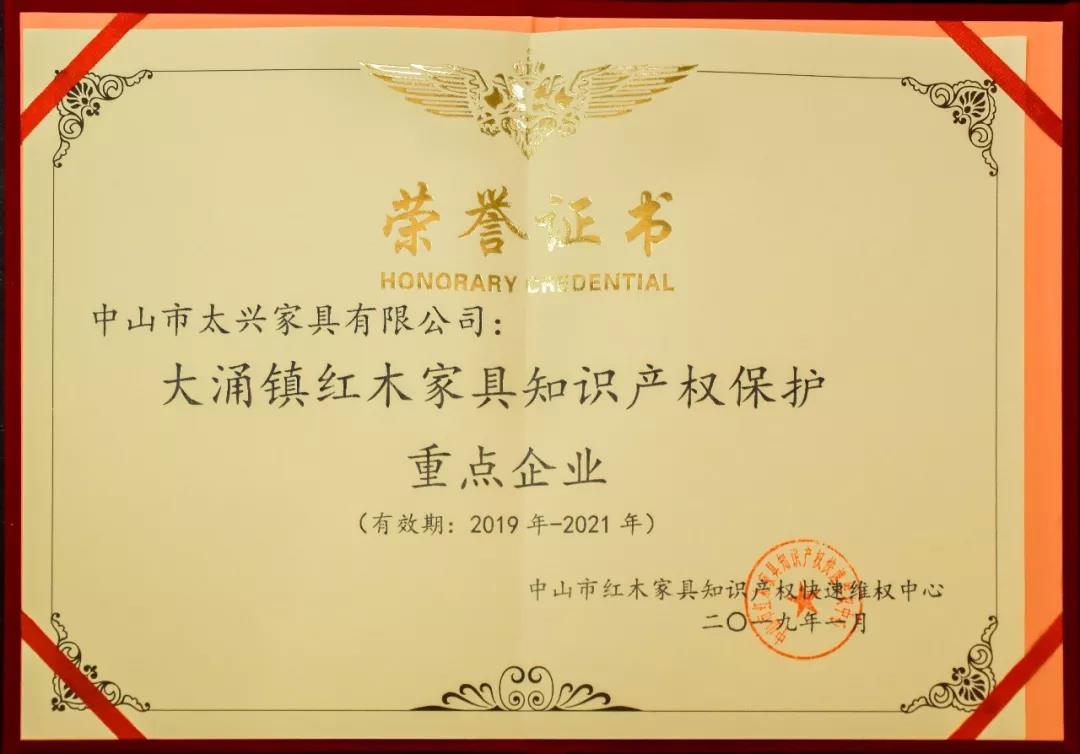 2019年元月15日,中山市太兴家具有限公司获得由中山市红木家具知识产权快速维权中心颁发的“大涌镇红木家具知识产权保护重点企业”的授牌和荣誉证书,成为了红木家具知识产权维权企业中的一员。