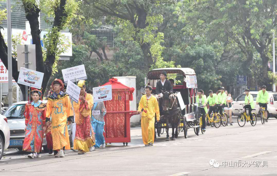 两匹骏马齐驱,“车夫”扬鞭驾车,成为街道上的一道亮丽的风景线,颇为吸睛,后面四位轿夫抬着“迎亲的轿子”让整个活动更加多了几分喜气,人气骤增,这是对传统文化的一次致敬,告别了以往“以节促销”的商业活动模式,少了一些“功利心”,多了一份“文化修养”。同时为了响应当下环保出行、绿色出行、健康出行的理念,特征集自行车骑行爱好者参加本次双节巡游活动,倡导时代先进理念,鼓励低碳生活,同时也在向各位宣扬太兴家具的“绿色环保”的企业发展理念,时刻不忘作为企业的社会使命与责任,共同努力,携手打造美好生活。