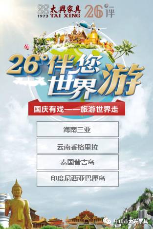 当然,太兴家具怎么能不回馈一直以来关心与支持我们的客户呢?!为了庆祝中华人民共和国成立68周年,让诸位感受到中秋阖家团圆之浓情,太兴家具给出钜惠活动,到店客户只要登记便可“免费”定制你的专属个性之家,并可获取精美礼品一份。这些还不算,我们更是打造家庭旅游计划,国庆中秋双节相聚一家亲,为各位创造一家团圆,共同出行旅游的机会,充分展现我们企业的品牌理念与企业的人文文化,来吧,让我们趁着双节,陪着家人到世界各地去走走。