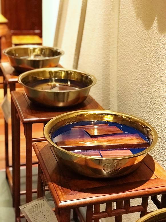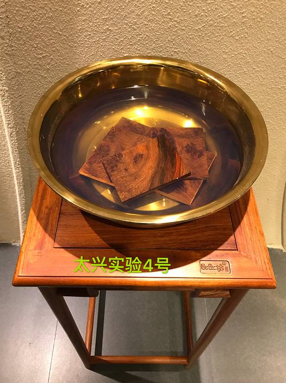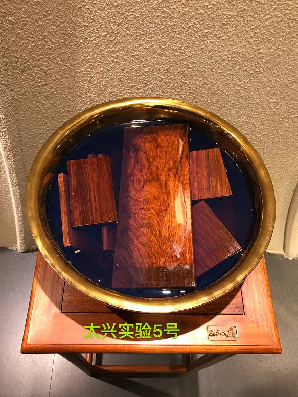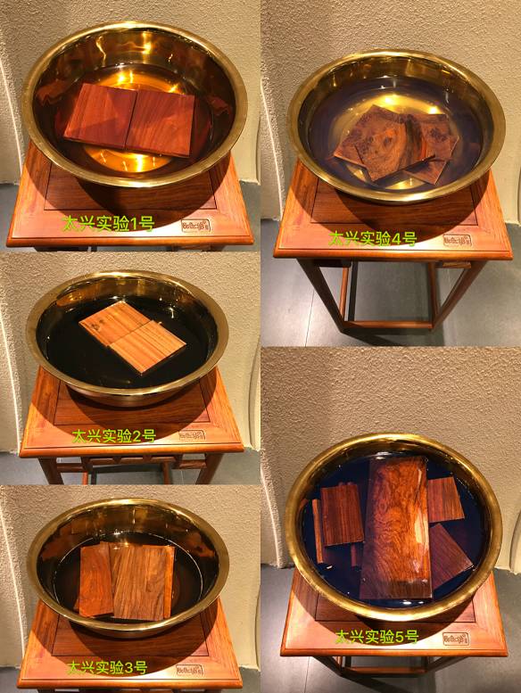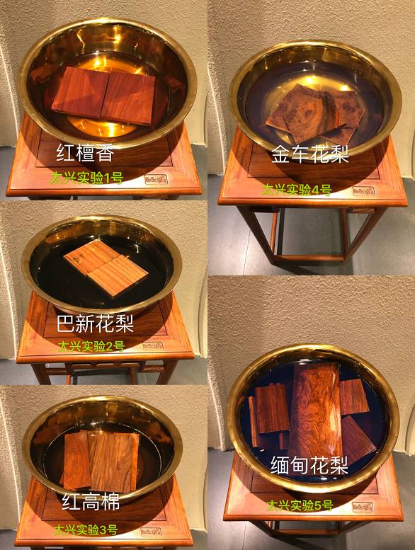 其实,最难作假的辨别真伪的手段就是“浸泡法”!目前市场主要用来替代缅甸花梨进行造假的木材有:红高棉、红檀香、金车花梨、巴新花梨等主要四种木材!太兴家具为了让消费者能够更加直观的辨别缅甸花梨,特地将这四种木材与缅甸花梨进行了浸泡,并将这个实验结果一直在展厅展示给每一位消费者去观摩!其实稍有了解的人都知道,缅甸花梨只要经过水浸泡3-4个小时之后,其浸出液呈现明显的蓝色,缅甸花梨因为其木素和抽提物的特殊性,使得它这一特征是其他掺假的木材所无法呈现的,所以大家要想买到放心的缅甸花梨家具就要花点时间去“泡一泡”,一泡就现原形了呢!