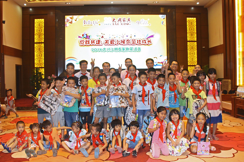 2016年8月20日下午,在太兴家具三楼贵宾厅里欢声笑语,到处是红领巾的身影,原来“党群共建,关爱小候鸟茁壮成长”—— 2016太兴小朋友暑期茶话会活动在此举行,来自太兴家具员工的小朋友四十多人齐聚一堂,念古诗、学做家具。发布日期:2016-08-20